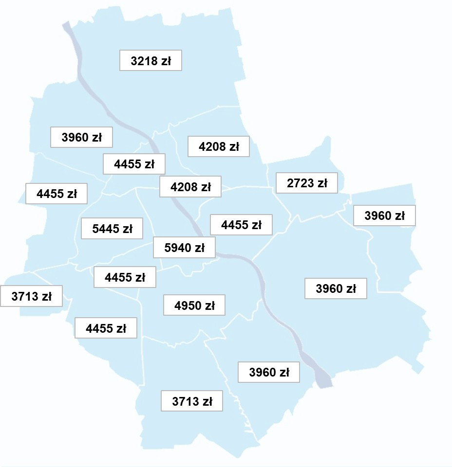 Poniżej prezentujemy średnią cenę wynajmu dwupokojowego mieszkania o powierzchni 50 mkw w zależności od lokalizacji nieruchomości. Wynajmując mieszkanie w dzielnicach centralnych możemy liczyć na wyższą cenę, niż w dzielnicach bardziej oddalonych od centrum.