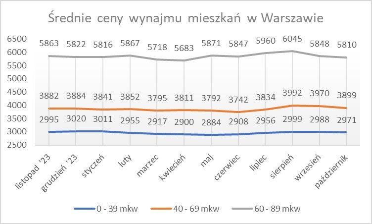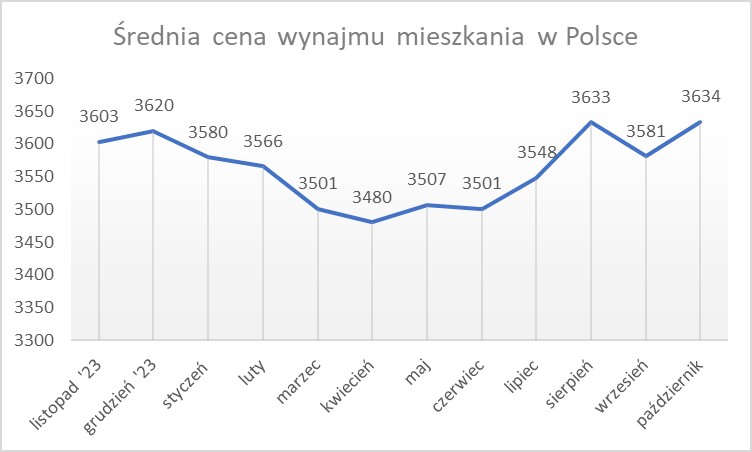 Wykres powyżej prezentuje średnie ceny wynajmu mieszkań w Polsce w okresie roku od listopada 2023 roku do października 2024 roku. Nie uwzględnia on jednak wielkości wynajmowanych mieszkań. Dane pochodzą z jednego z portalu z ogłoszeniami najmu mieszkań i są opracowane na podstawie zamieszczonych ofert (średnio 25 tys. ogłoszeń miesięcznie).