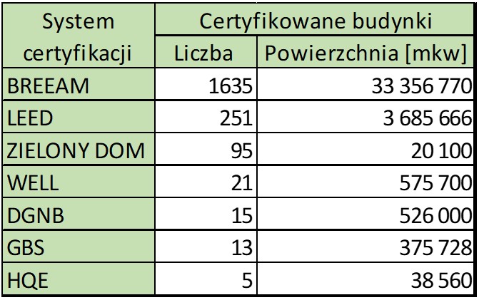 W Polsce na początku 2024 roku 2035 budynków posiadało co najmniej jeden certyfikat potwierdzający jego efektywność ekologiczną, a łączna ich powierzchnia wynosiła 38 578 524 mkw.